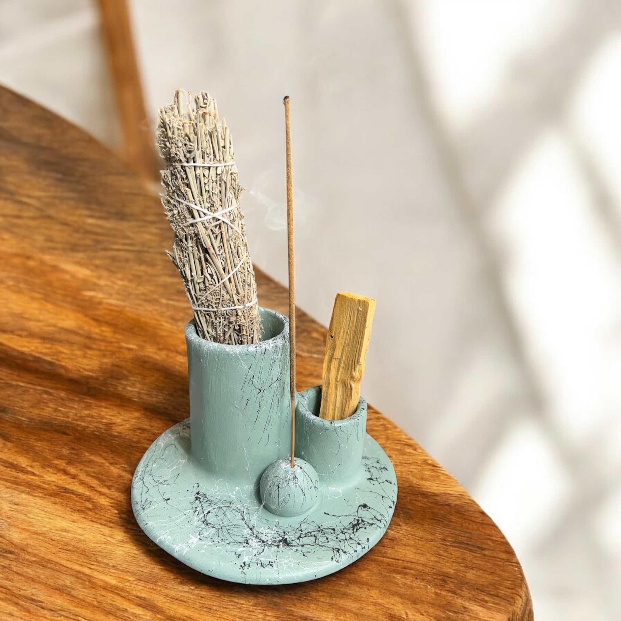 Bu özel tasarım 3 bölmeli taş tozundan yapılmış tütsülük, Palo Santo, bitki tütsüsü ve çubuk tütsüler için ayrı ayrı bölmeler sunarak niyetlerini düzenlemen, alanını dengelemen ve ritüelini derinleştirmen için seni davet ediyor.