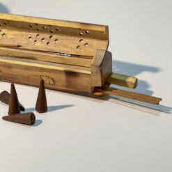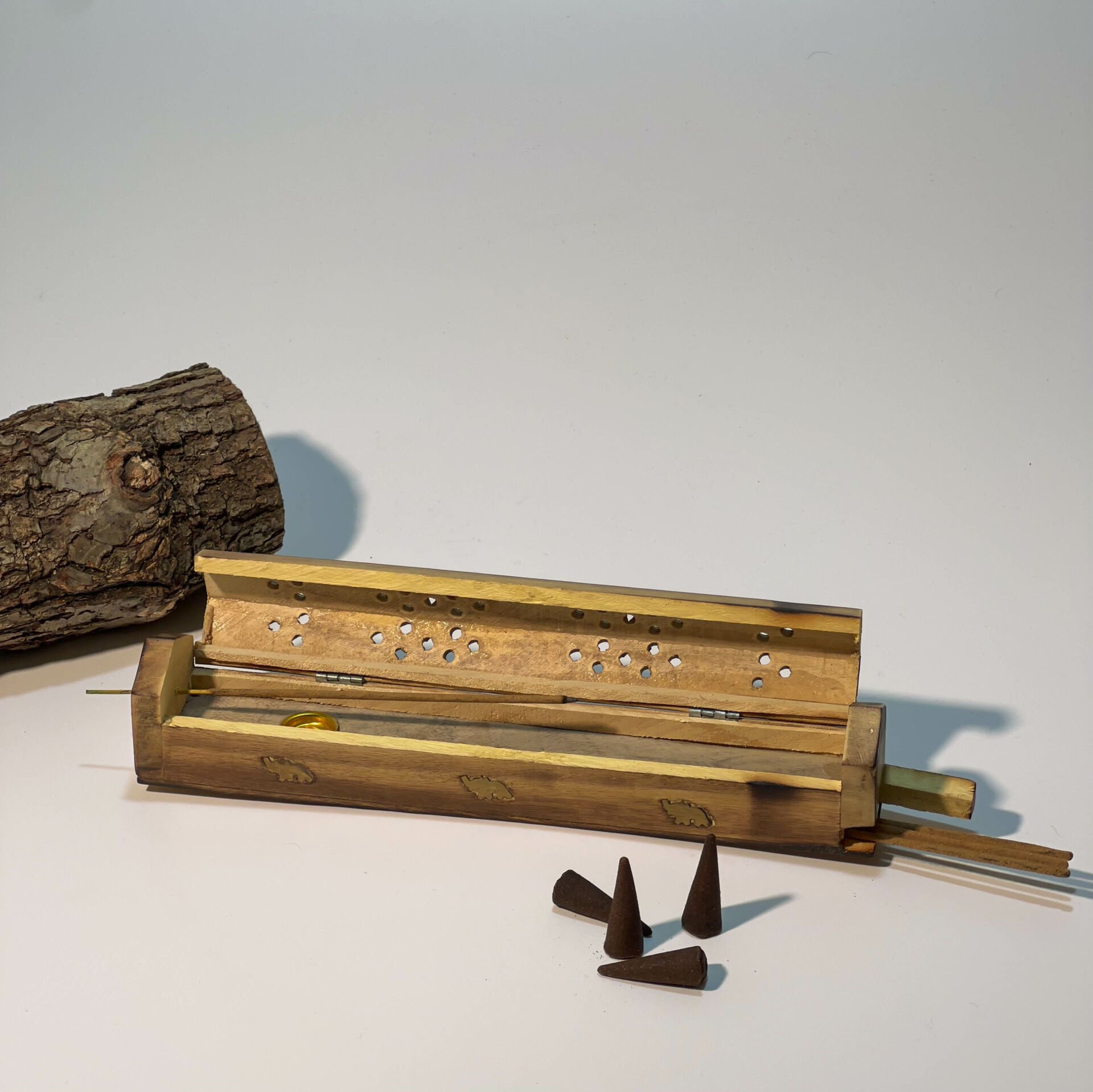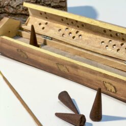 - Doğal ahşaptan yapılan tütsülük, yurtdışından ithal edilmektedir. Maun ağacından yontularak el işçiliğiyle yapılmıştır ve üzerinde şans getirdiğine inanılan sarı pirinç fil motilleri bulunmaktadır. Ahşap tütsülüğü açtığınızda tütsü çubuklarını saklayabileceğiniz bölümü bulunur. Yanan tütsülerin ahşaba zarar vermemesi için 1 adet mistik görünümlü metal bulunur.